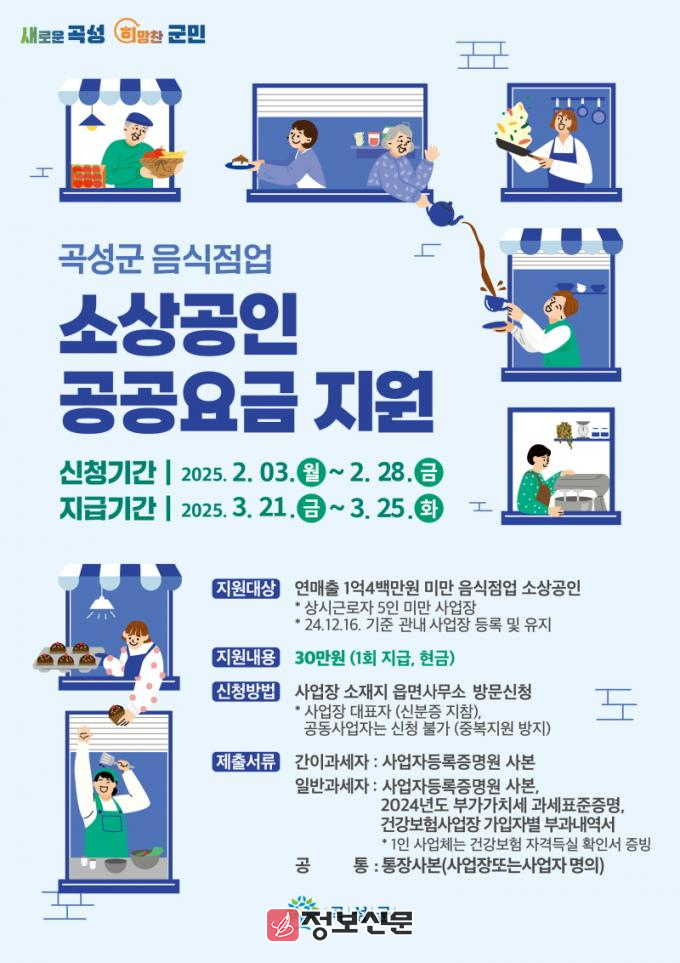 지원 대상은 연 매출액이 1억 400만 원 미만, 상시근로자가 5인 미만이고 사업자등록증 상 업태가 ‘음식점업’인 소상공인이다. 2024년 12월 16일을 기준으로 곡성군 내 사업장을 등록해 유지 중이어야 한다.