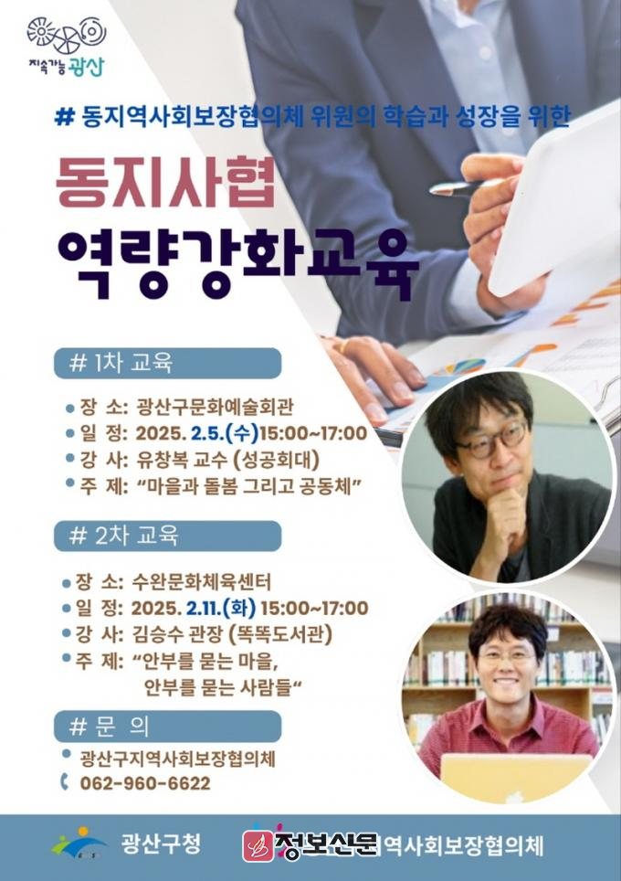 광산구 관계자는 “이번 역량강화 교육을 통해 동 지사협 위원들이 서로 지혜를 나누고 급변하는 환경의 복지 혁신을 준비하는 장이 되길 바란다”고 전했다.