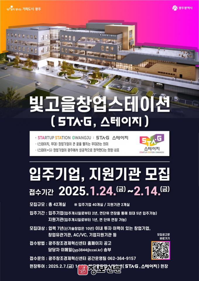 광주광역시(시장 강기정)는 지난해 12월 광주역 창업밸리 첫 인프라인 ‘빛고을창업스테이션’(STA‧G, 이하 스테이지)을 준공, 오는 14일까지 입주 기업을 모집한다.