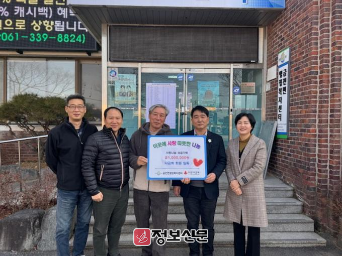 유지영 금천면장은 “지역사회를 향한 따뜻한 관심과 나눔을 실천해 주신 나금회 회원들께 깊이 감사드린다”며 “앞으로도 어려운 이웃들을 세심하게 살피고 촘촘한 복지 행정을 실현하기 위해 최선을 다하겠다”고 밝혔다.
