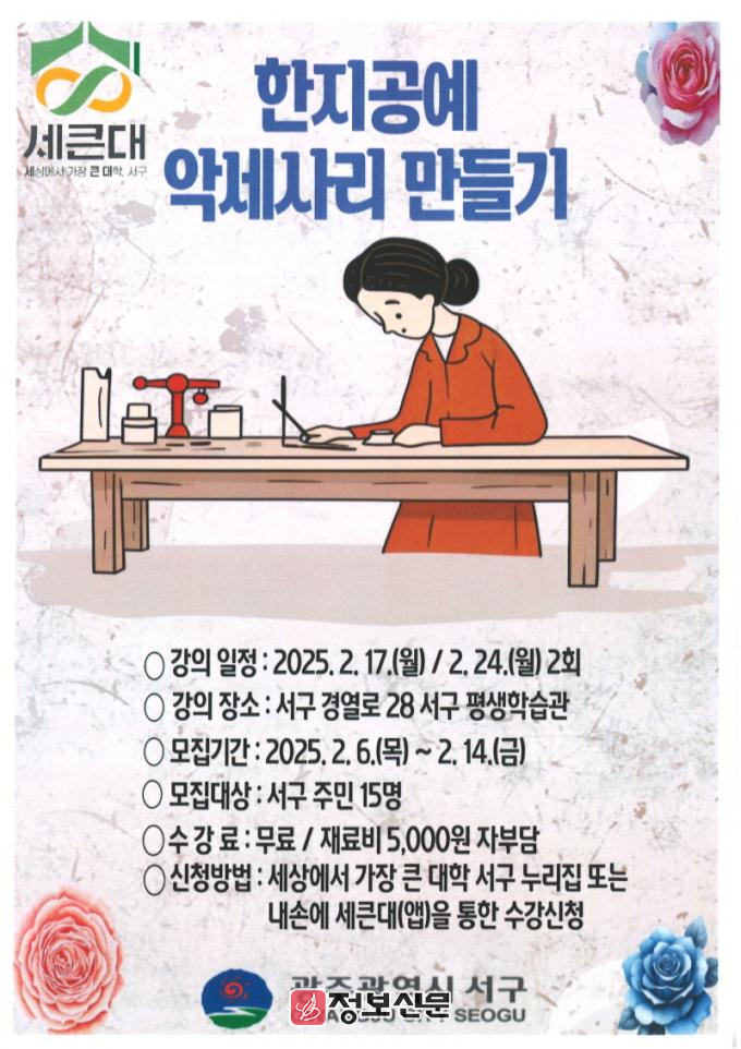 신청은 2월 6일(목)부터 2월 14일(금)까지 서구민이면 누구나 ‘세큰대’ 누리집(www.seogu.gwangju.kr/365edu) 또는 “내손에 세큰대”앱을 통해 할 수 있으며, 자세한 사항은 서구 세큰대팀(062-350-4973)으로 문의하면 된다.