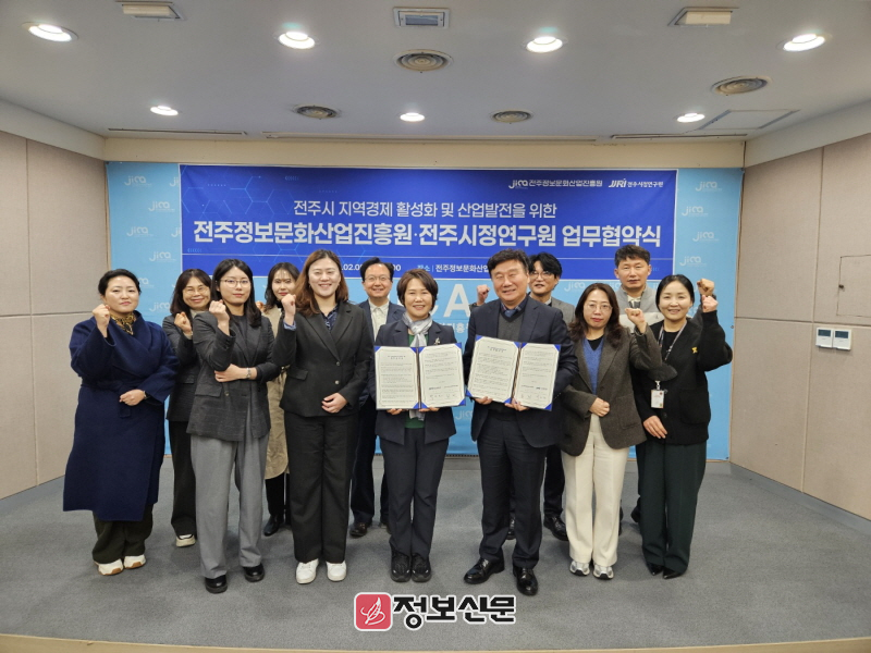 전주정보문화산업진흥원(이하 진흥원)과 전주시정연구원(이하 연구원)은 5일 진흥원 세미나실에서 허전 원장과 박미자 원장 등 양 기관 관계자들이 참석한 가운데 ‘지역경제 활성화 및 지역산업 발전을 위한 업무협약(MOU)’을 체결했다.