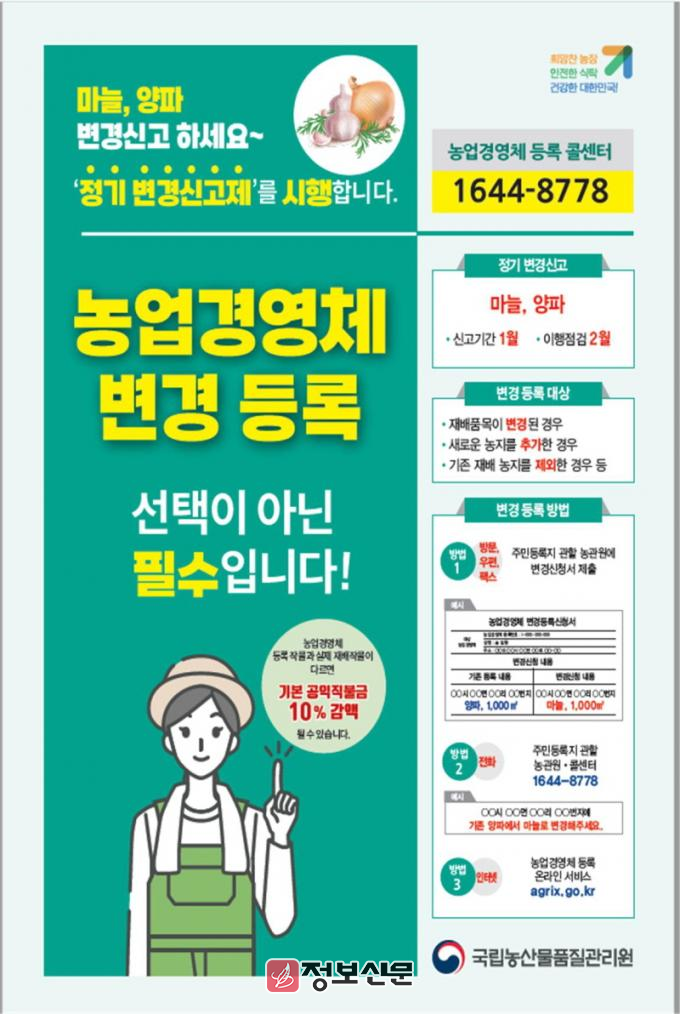 ![]() 국립농산물품질관리원 장흥사무소, 농업경영체 양파·마늘 변경사항 신고하세요 |