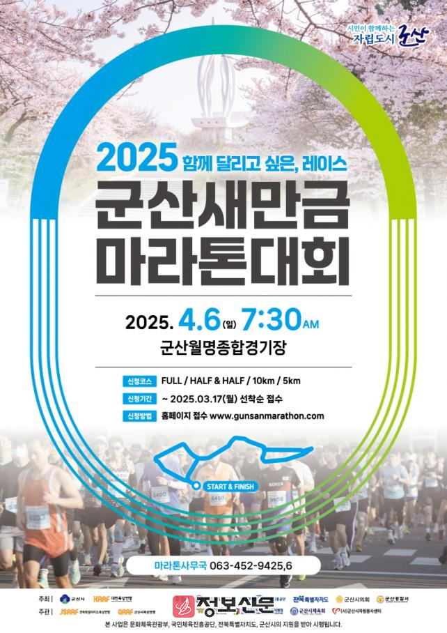 오는 4월 6일 군산시 일원에서 열리는 ‘2025 군산 새만금 마라톤대회’는 군산시와 대한육상연맹이 공동주최하고 전북 특별자치도 육상연맹과 군산시 육상연맹이 주관한다.