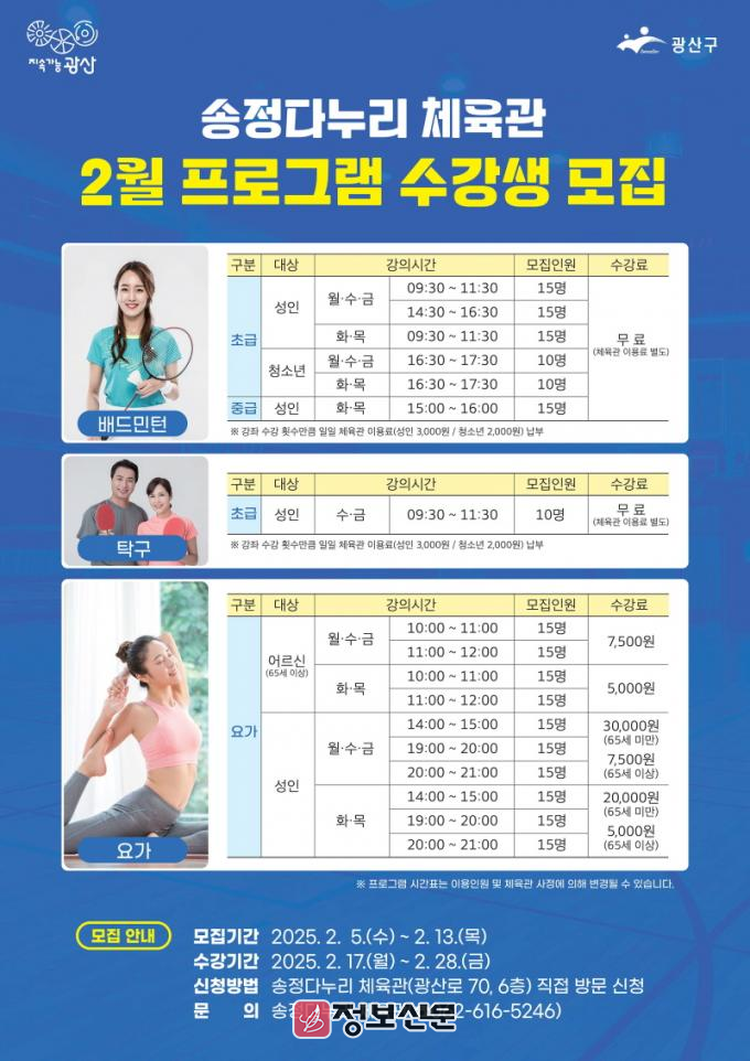 신청 대상은 13일까지 주민 누구나 신청할 수 있으며 송정다누리체육관(광산구 광산로 70, 6층)에서 선착순으로 현장 접수하고 있다. 프로그램에 관련한 자세한 사항은 광산구 송정다누리체육관 안내데스크(062-616-5246)로 문의하면 된다.