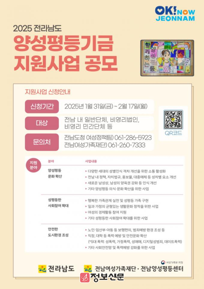 ![]() 전라남도, 양성평등 문화 확산 위한 기금사업 공모 |