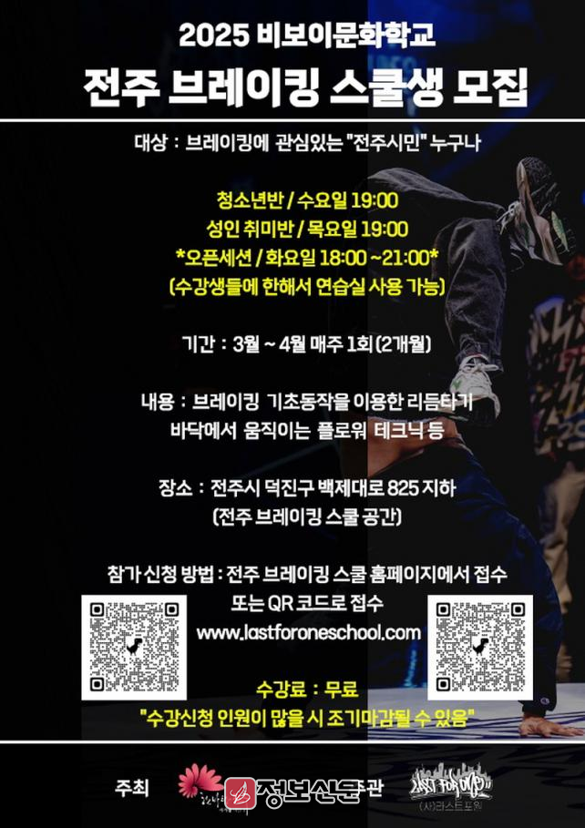 수강생 모집은 신청자가 많을 경우 조기 마감될 수 있으며, 수강 신청 및 자세한 사항은 전주브레이킹스쿨 누리집에서 확인할 수 있다.
