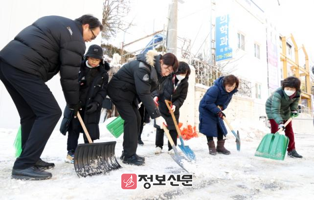 이날, 양 구청과 35개 동의 팀장급 이상 공무원은 각 동의 자생단체들과 함께 시민들이 다수 이용하는 공공시설 주변과 경사로, 민원 다발 지역, 위험지구 등을 중심으로 제설작업을 벌였다.