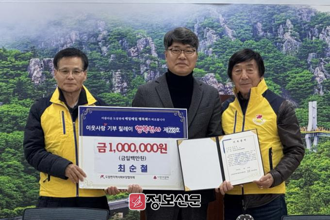 이와 함께 산정마을 이장 부부가 추운 겨울을 나고 있는 취약계층을 위해 100만원을 기부했으며, 지석마을 김점권씨가 작년에 이어 올해도 도암면 지역사회보장협의체에 500만원원을 쾌척하며 ‘이웃사랑 행복 천사 기부 릴레이’에 기꺼이 동참했다.