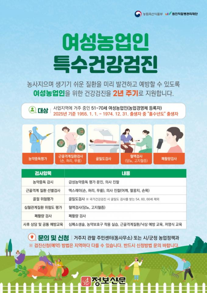 여성농업인 특수건강검진은 일반건강검진과 달리, 여성농업인이 취약한 질환을 조기에 발견하고 예방할 수 있도록 마련됐다. 검진 항목에는 농작업으로 인해 발생하기 쉬운 근골격계, 심혈관계, 골절·손상 위험도, 폐 기능, 농약 중독 등 5개 영역, 10개 항목이 포함되며, 검진 후에는 사후관리 및 예방을 위한 교육과 전문의 상담도 함께 제공된다.