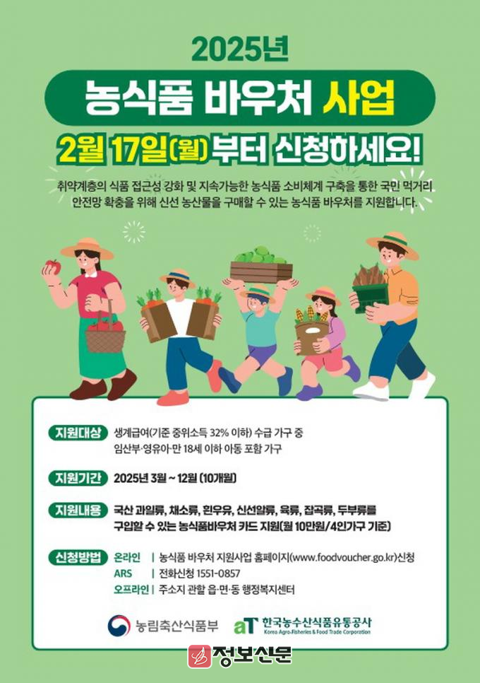 신청은 2월 17일부터 12월 12일까지 주소지 관할 읍면동 주민센터나 농식품 바우처 누리집(www.foodvoucher.go.kr.), ARS(☎1551-0857)를 통해 가능하다.