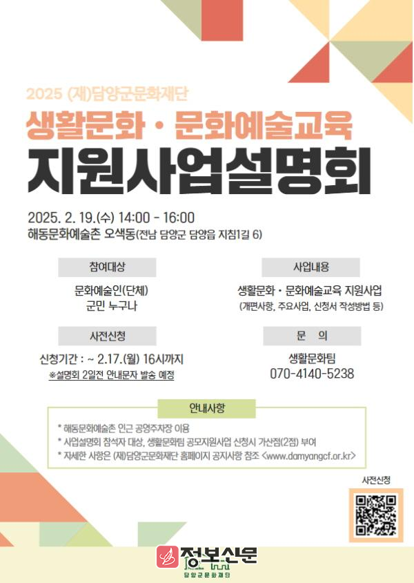 이번 설명회는 2025 담양군문화재단 생활문화·문화예술교육지원 사업에 대한 안내와 주요 개편사항, 지원항목, 신청 절차 등을 설명할 예정이며, 재단 홈페이지www.damyangcf.or.kr) 신청 링크를 통해 오는 17일 오후 4시까지 사전 접수 가능하다.