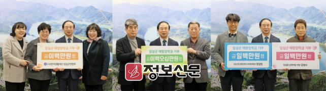 (사)한국생활개선 임실군연합회(회장 정현옥)가 200만원, 임실개인택시 단위조합(조합장 왕동열)이 250만원, 임실읍 상원마을 김영수 이장이 100만원, 임실군청 종합민원과 정일범 주택정책팀장이 100만원을 임실군 애향장학금으로 기부했다고 11일 밝혔다.