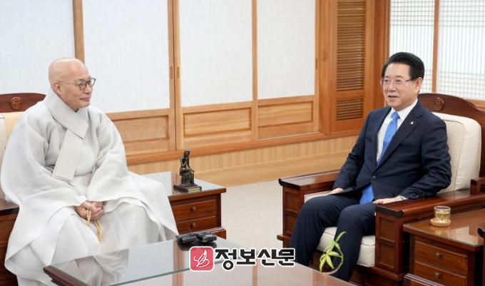 이에 김영록 지사는 “총무원장께서 올해의 화두로 ‘소통’과 ‘화쟁’을 제시했는데, 화쟁을 향한 소통의 길만이 대한민국 공동체의 번영을 지켜줄 수 있다는 말씀에 깊이 공감한다”고 밝혔다. 이어 “필요하다면 새로운 제도 도입을 통해 사회 갈등과 분열을 극복하고 대한민국 재창조에 앞장서야 한다”며 “앞으로도 종교 지도자로서 귀한 가르침을 부탁한다”고 덧붙였다.