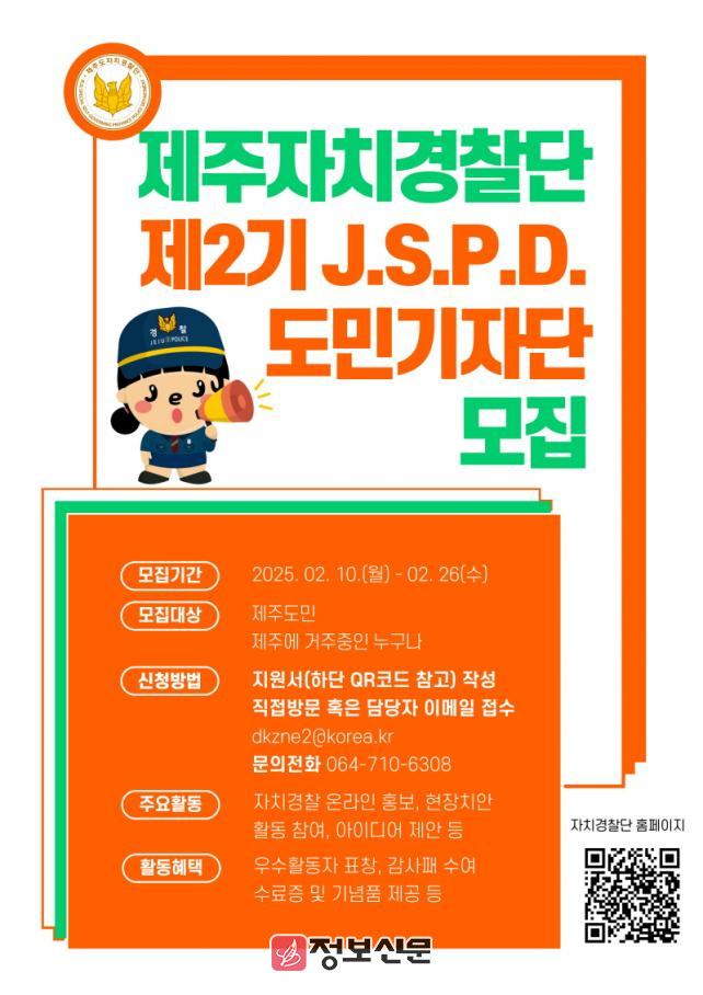 ![]() 제주특별자치도 자치경찰단, 제2기 J.S.P.D. 도민기자단 모집 |