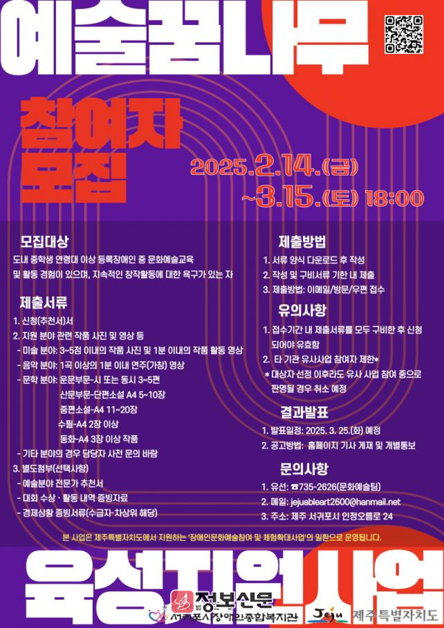 ![]() 서귀포시장애인종합복지관, 2025 예술꿈나무육성지원사업 참여자 공개 모집 |