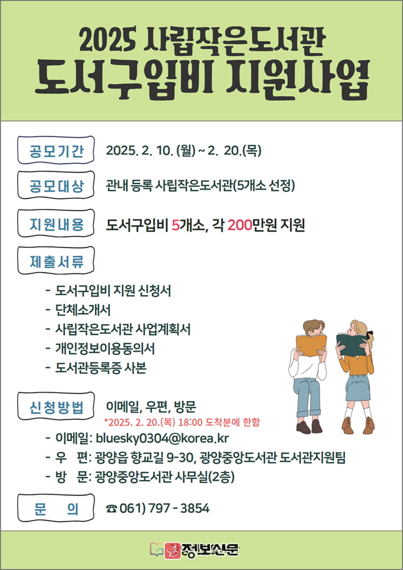 ![]() 광양시, 2025년 사립작은도서관 도서구입비 지원 사업 공모 |