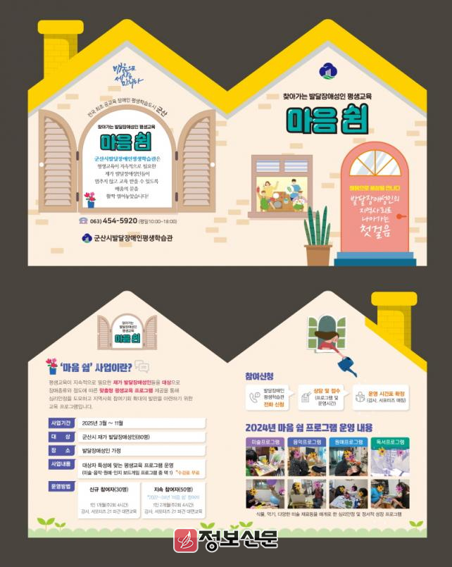 ![]() 군산시, 찾아가는 발달장애성인 평생교육 ‘마음 쉼’ 1기 수강생 모집 |