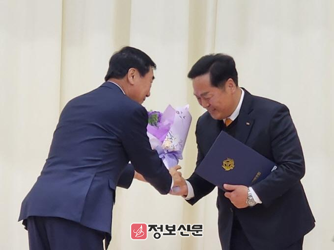 ![]() 광주동부신협 구희상 이사장이 지난 15일 광주남초등학교 체육관에서 열린 '광주동부신협 제45차 정기총회'에서 문상준 조합원에게 우수조합원 표창장을 수여 하고 있다. |