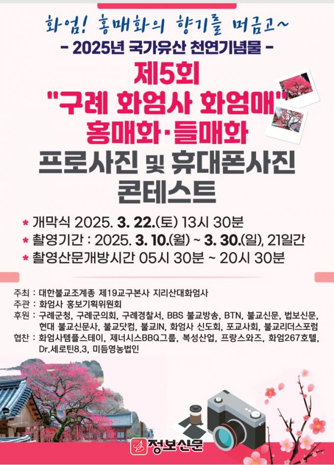 ![]() 대한불교조계종 지리산대화엄사, 제5회 구례 화엄사 홍매화 사진 콘테스트 개최 |