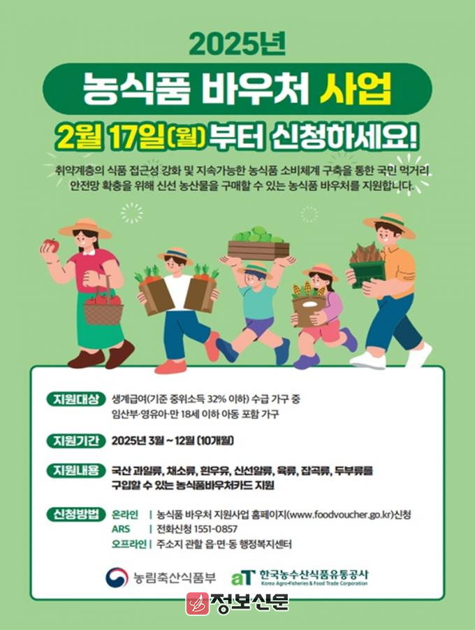 남택송 농업동물정책과장은 “농식품 바우처 사업을 통해 취약계층이 양질의 먹거리를 확보하고 지속할 수 있는 농식품 유통체계를 구축할 수 있도록 최선을 다하겠다”고 말했다.
