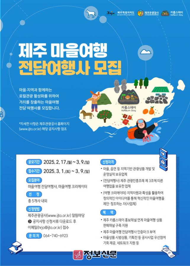 ![]() 제주관광공사, 제주 마을 여행 전담 여행사 및 크리에이터 모집 |