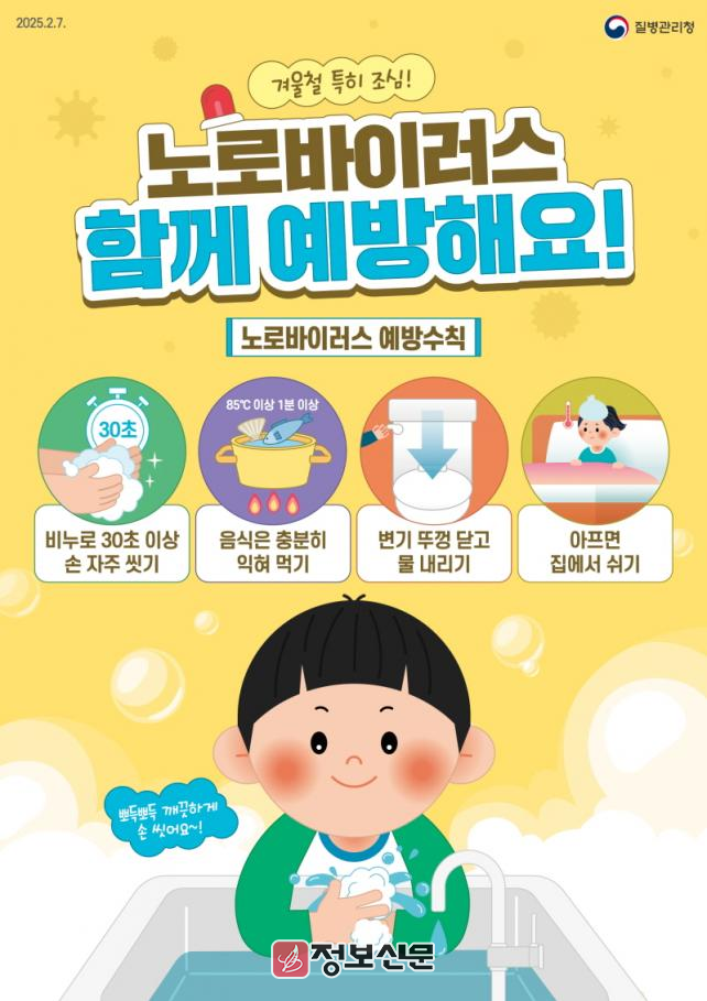 또한, 노로바이러스감염증 환자는 △증상이 사라진 후 48시간까지 등원·등교 및 출근 자제 △화장실을 비롯한 생활공간 구분 △배변 후 변기 뚜껑 닫아 비말로 인한 노로바이러스의 확산을 차단하도록 해야한다.