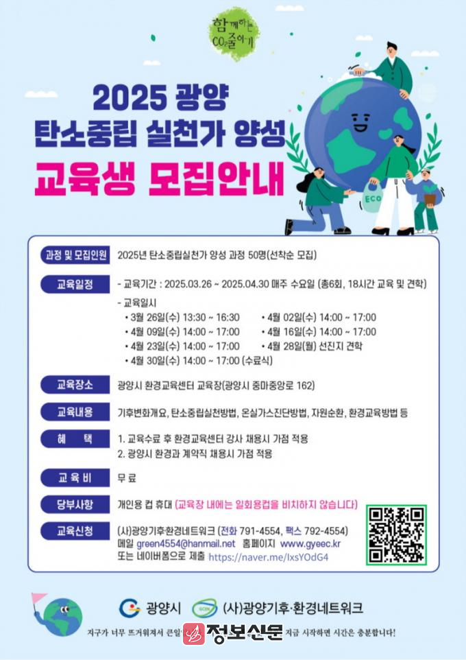 교육 신청은 전화(☎ 791-4554), 팩스(☏ 792-4554) 또는 네이버 폼을 통해 가능하다. 자세한 내용은 광양시청 누리집(https://gwangyang.go.kr) 공지사항에서 확인할 수 있다.