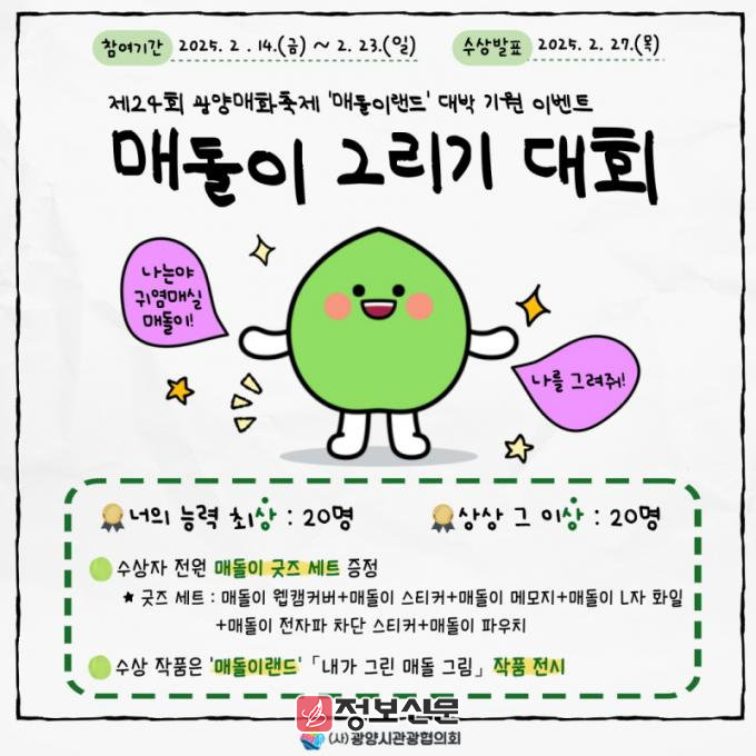 제출기한은 오는 23일까지다. 참가 희망자는 광양 대표 캐릭터인 ‘매돌이’를 주제와 형식에 구애받지 않고 자유롭게 표현해 협의회 누리집의 QR코드 및 (https://naver.me/517gtoGX) 또는 이메일(tourismhero@gmail.com)로 제출하면 된다. 단, 작품은 반드시 본인이 직접 그린 그림이어야 하며, 본인 SNS에 그림을 업로드하고 인증 링크를 첨부하면 수상 확률이 높아진다.