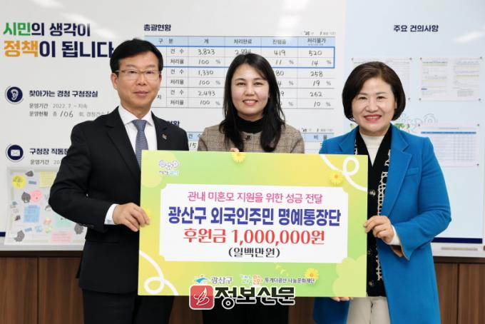 광산구 외국인주민 명예통장단은 지난 2023년 폭력 피해 아동 지원으로 100만 원을 기부하는 등 지역사회를 위해 매년 다양한 봉사와 기부 활동을 이어오고 있다.