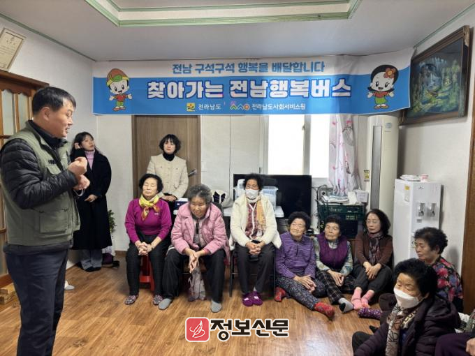 ‘찾아가는 전남행복버스’는 전라남도(사회서비스원)와 함평군이 협업해 도심과 떨어져 사회서비스가 열악한 농촌 주민에게 맞춤형 의료·보건·복지서비스를 지원하는 사업이다.