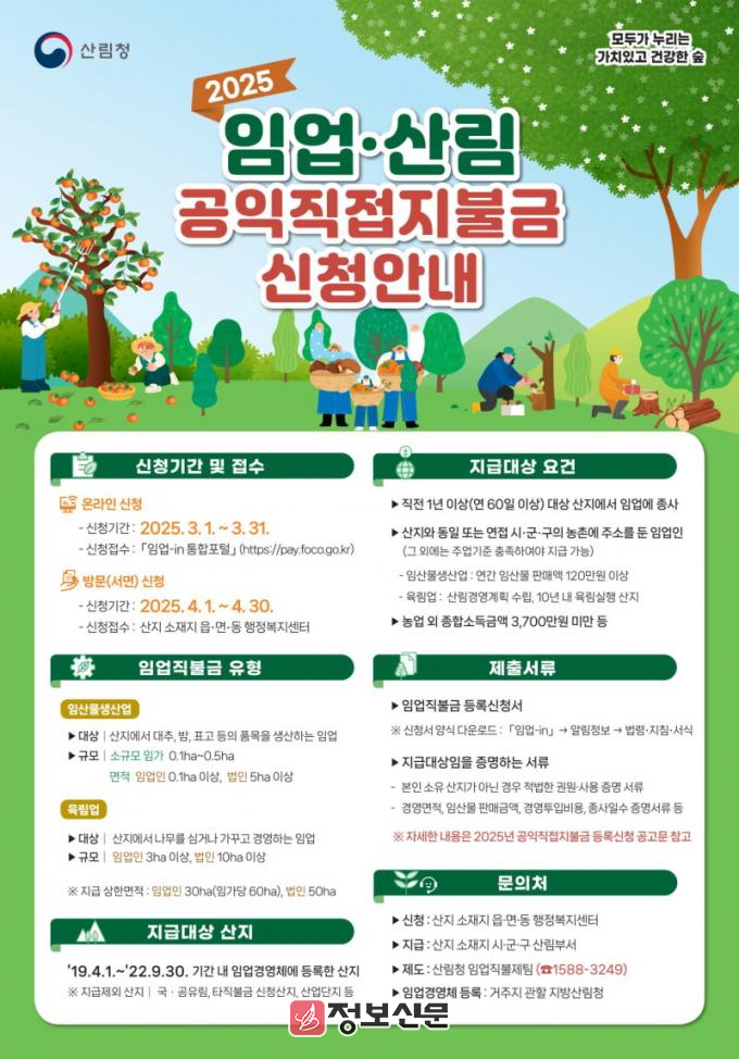 특히, 올해는 임업인의 신청 편의를 위해 임업직불금 신청 기간을 1개월 앞당겨 접수 기간을 2개월 동안 운영할 계획이다. 온라인 신청 기간은 3월 1일부터 3월 31일까지이며 ‘임업-in 통합포털(www.pay.foco.go.kr)’에서 신청할 수 있다. 방문 신청은 4월 1일부터 4월 30일까지이며 산지 소재지를 담당하는 읍‧면‧동 행정복지센터에 방문해 신청서를 제출하면 된다.
