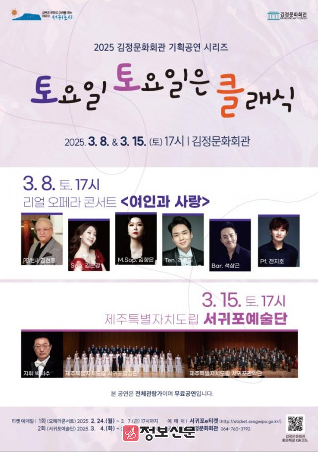 서귀포시 김정문화회관의 『토요일 토요일은 클래식』 공연은 3월 8일 <여인과 사랑>을 시작으로 3월 15일 서귀포예술단의 합동 공연까지 다양한 클래식 음악 공연을 선보이며 관객들에게 재미와 감동을 선사할 것이다.