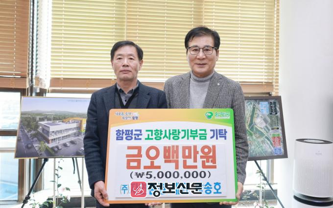 함평군은 20일 “㈜자연환경 곽송호 대표이사가 전날 함평군청을 찾아 고향사랑기부금 500만원을 기탁했다”고 밝혔다.