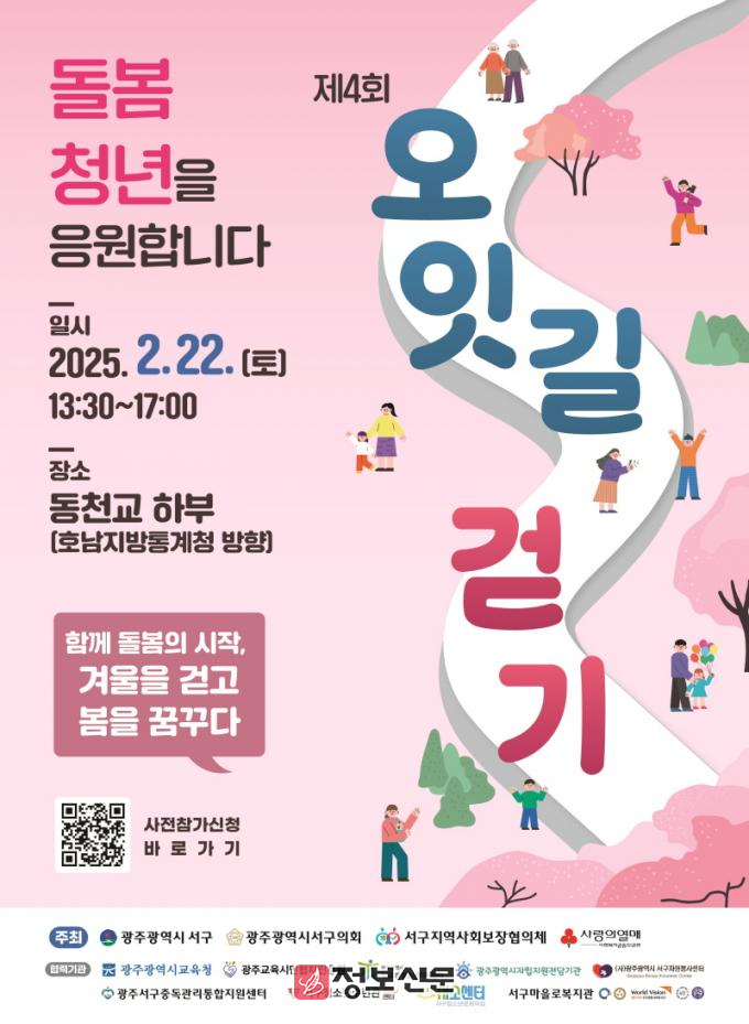 오잇길 걷기대회는 참가비 ‘오(5)천원’을 내고 함께 걸으면서 ‘이(2)웃’에게 희망을 전하는 서구만의 주민참여형 복지사업으로 2023년부터 이어오고 있다. 이번 대회는 ‘함께 돌봄의 시작, 겨울을 걷고 봄을 꿈꾸다’를 주제로 오후 2시 22분 광주천 인근 동천교 하부에서 출발해 광운교 하부를 반환점으로 돌아오는 코스(5.2㎞)로 진행된다.