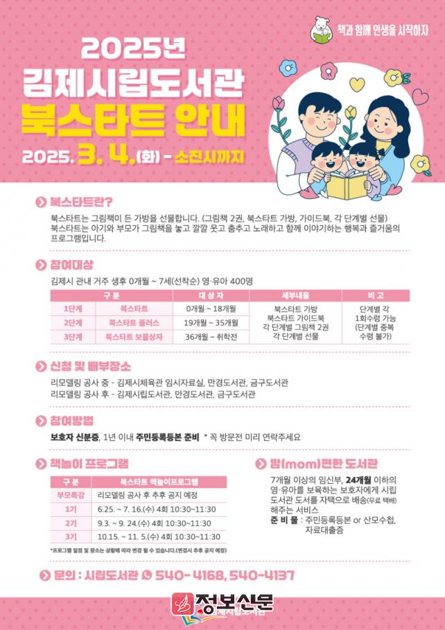 ![]() 김제시립도서관, 2025년 북스타트 책꾸러미 배부 사업 운영 |