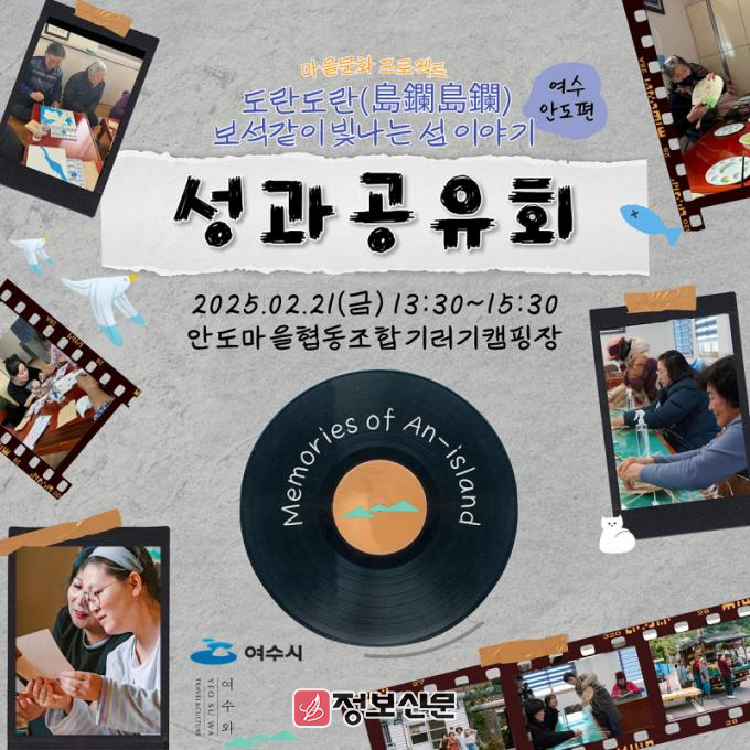 이번 성과공유회는 ‘여수와’ 주관으로 오후 1시부터 3시 30분까지 안도마을협동조합 기러기캠핑장에서 열리며, 지난 4개월간 진행한 마을문화 프로젝트 결과물을 선보이고 지역 주민과 예술가의 협업을 조명할 예정이다.