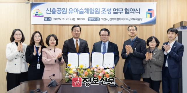익산시는 20일 익산교육지원청과 '신흥공원 유아숲체험원 조성사업' 추진을 위한 업무협약을 체결했다. 정헌율 익산시장과 정성환 전북특별자치도익산교육지원청 교육장은 예산 지원 등 유아숲체험원의 조성·운영에 적극 협력하기로 했다.