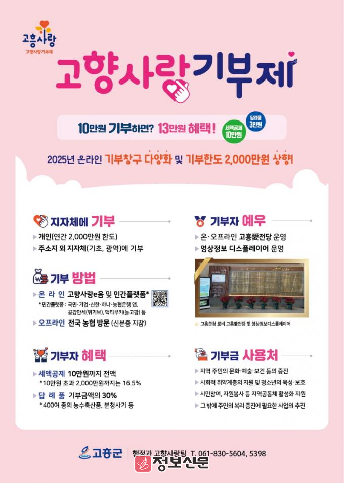 이번 프로젝트 주요 내용은 ▲기부자 편의도모를 위한 민간 플랫폼 도입 ▲고흥 출신 출향인(출향인 2세) 네트워크 강화 ▲고흥특산물을 활용한 차별화된 답례품 개발 ▲지역 특색 살리는 주민 주도형 지정 기금사업 발굴 ▲고액 기부자 명예의 전당 추가설치 등 20개의 시책을 확대해 추진한다.