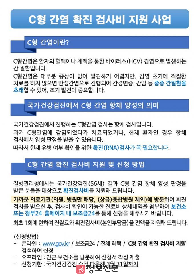 확진 검사비 지원 대상은 56세(1969년생)로 국가건강검진에서 C형간염 항체검사 결과 양성판정을 받아 (상급)종합병원을 제외한 병‧의원을 통해 C형간염 확진검사(HCV RNA 유전자 검출 검사)를 받은 군민으로, 최초 1회에 한하여 진찰료와 확진 검사비 본인부담금 전액을 지원한다. 식비, 교통비 등 간접비용과 C형간염 확진 검사와 무관한 진료비용은 제외된다.