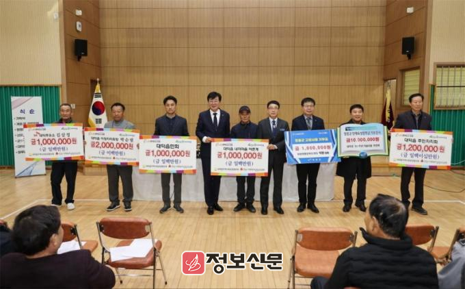 19일 대덕 다목적복지관에서 개최된 대덕읍 이장자치회 상견례 행사에서 여러 관내 단체·기업 및 개인들이 지역의 어려운 이웃을 돕기 위해 성금을 기부했다.