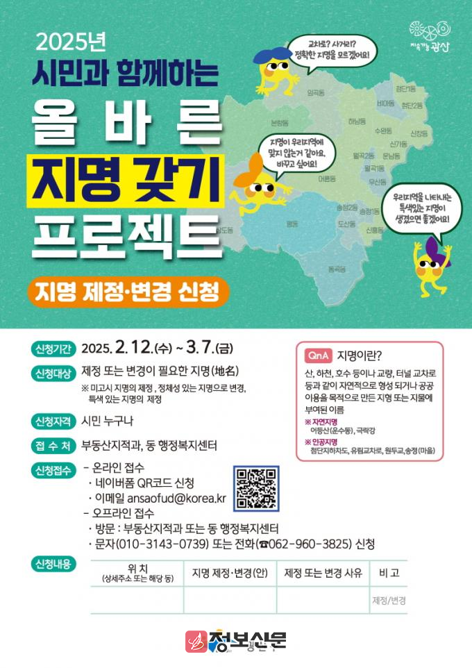 지명 갖기 사업에 대한 자세한 사항, 참여 문의는 광산구 부동산지적과(062-960-3825)에 하면 된다.