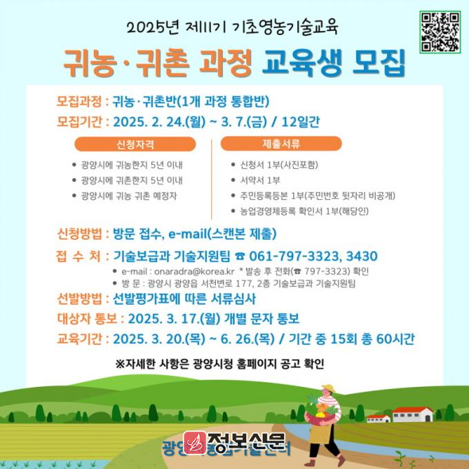 ![]() 광양시, 제11기 기초영농기술교육 귀농·귀촌과정 교육생 모집 |
