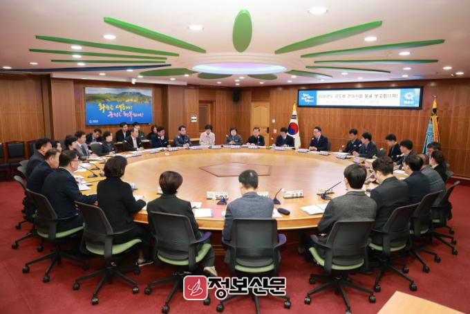이날 보고회는 구복규 군수 주재로 부군수, 전 부서장 27명이 참석하였고, 2026년 국․도비 건의 사업 총 67건 중 신규 발굴 30건을 포함, 국비 1,153억 원에 대한 사업 추진계획 보고와 재원 확보 방안 등을 중점 협의했다.