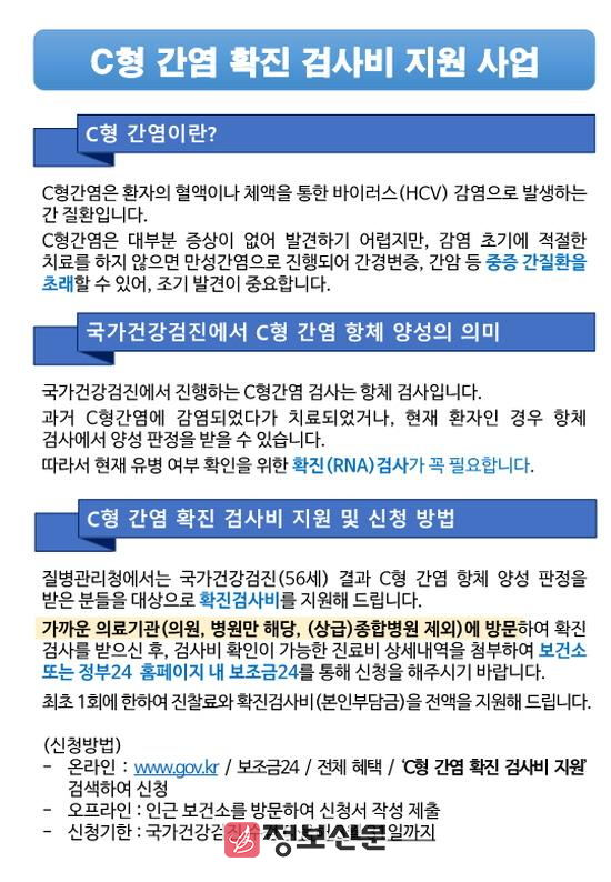 이번 사업은 조기 발견이 중요한 C형간염의 특성을 고려해 시행된다. 광양시는 올해 기준 56세(1969년생) 국가건강검진 수검자 중 C형간염 항체 양성 결과를 받고, 병·의원(상급, 종합병원 제외)에서 확진 검사를 받은 사람을 대상으로 최초 1회에 한해 진찰료와 확진 검사비 본인부담금 전액을 지원할 방침이다.
