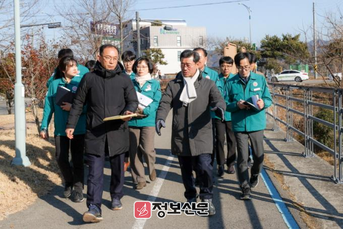 정 시장이 이날 두 번째로 찾은 곳은 지난해 12월 준공된 광양읍 서산 맨발걷기길 현장으로, 이곳은 서산 데크길과 서천운동장을 연결하는 산책로로 사용되고 있다. 직접 길을 걸으며 시설물을 점검한 정 시장은 시민 편의를 위해 수도시설 안내판을 설치하고 바닥 돌출물 제거 및 사면 정비 등 환경 개선을 철저히 진행할 것을 지시했다.