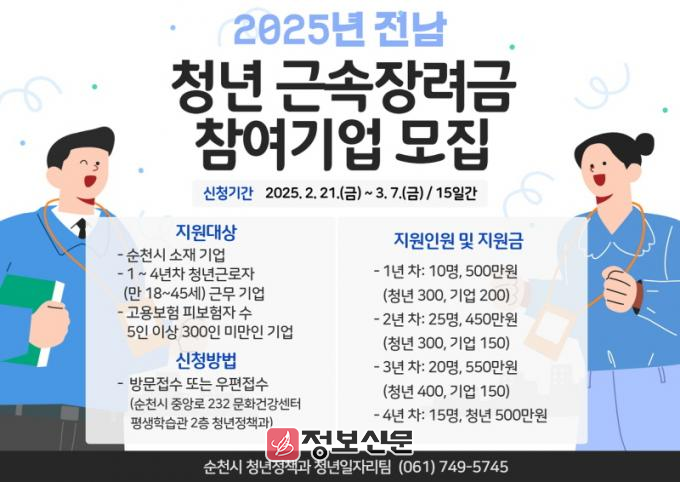 ![]() 순천시, 청년 근속장려금 지원사업 참여기업 모집 |
