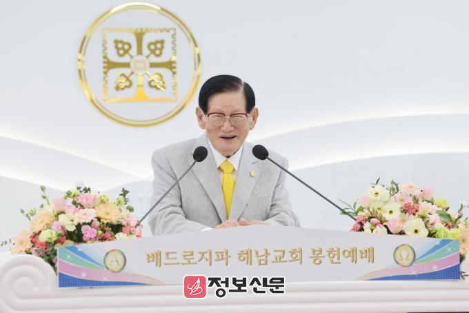 ![]() [사진 제공 = 신천지 광주교회]지난 23일 신천지 해남교회 봉헌예배에서 이만희 총회장이 설교하고 있다.