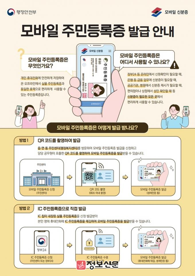두 번째는 기존 실물 주민등록증을 이용하는 방식으로, 행정복지센터에서 발급용 QR 코드를 촬영하면 즉시 발급받을 수 있다. 단, 휴대전화를 교체하거나 앱을 삭제하면 재발급이 필요하다.