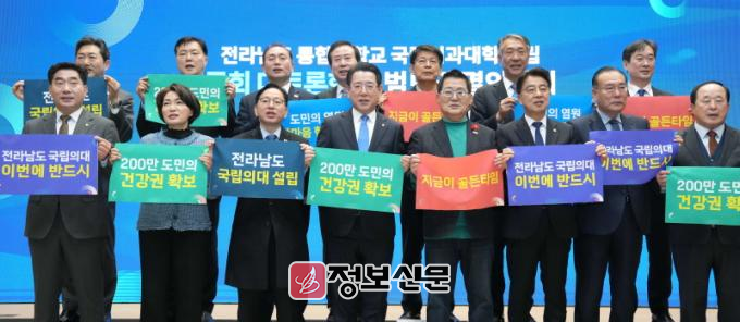 ![]() 김영록 전라남도지사가 24일 서울 국회에서 열린 ‘전라남도 통합대학교 국립의과대학 설립 국회 대토론회 및 결의대회’에서 국립의대 설립에 대한 200만 전남도민의 간절한 염원과 강한 의지를 전달하기 위해 참석자들과 퍼포먼스를 하고 있다.